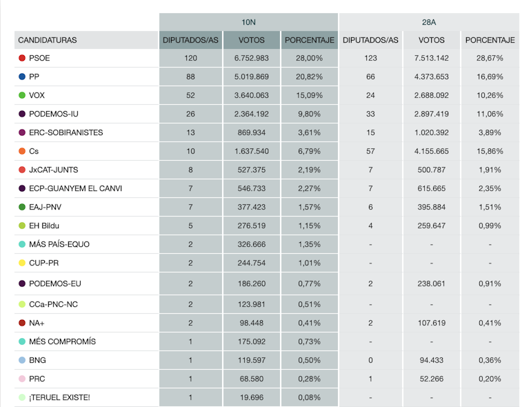 Las elecciones generales de este domingo 10 de noviembre han sido las cuartas en cuatro años. A pesar del escenario fuertemente marcado por la sentencia del “procés”, los resultados entre los bloques no han sido excesivamente distintos. Pero sí existen diferencias entre estas elecciones y las anteriores de abril, desde las variaciones de votos y escaños entre los distintos partidos de cada bloque, pasando por la campaña, hasta los nuevos actores políticos.