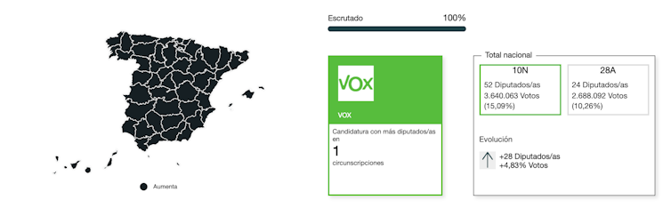 Las diferencias dentro de ellos son más reveladoras, aunque no se puedan establecer patrones claros de trasvase de votos. Sin embargo, los 52 escaños de Vox (28 más que en abril) y la subida del Partido Popular de 66 a 88, paralelos al desplome de Ciudadanos (de 57 a 10), que deja de ser la tercera fuerza para pasar a ser la sexta y que precipita la dimisión de Albert Rivera, apuntan de forma provisional a un marcado trasvase de votos entre las fuerzas de la derecha.