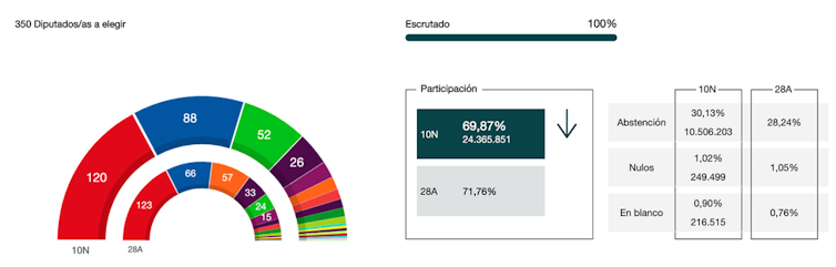 El surgimiento de algunos partidos, además, se justificó por la necesidad de recuperar al votante desencantado, aunque se ha terminado pagando un alto precio en votos por cada escaño. La participación se cerró unas décimas por debajo del 70 %, casi seis puntos menos que en las concurridas elecciones abril antes del ajuste del voto de residentes del extranjero. No obstante, es pronto para saber en qué medida ha afectado a cada bloque.