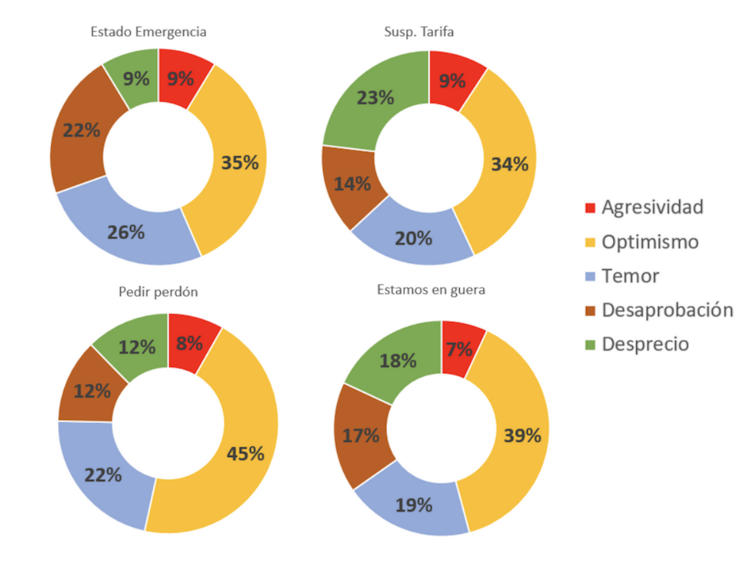 Tal como se puede distinguir en la Figura 2, Piñera tuvo un mayor optimismo en sus palabras cuando pidió perdón y anunció medidas para combatir la desigualdad (45%), mientras que el mayor grado de temor (26%) en su discurso se pudo observar en su primera intervención para declarar el estado de emergencia.
